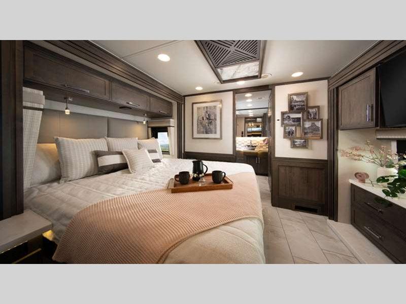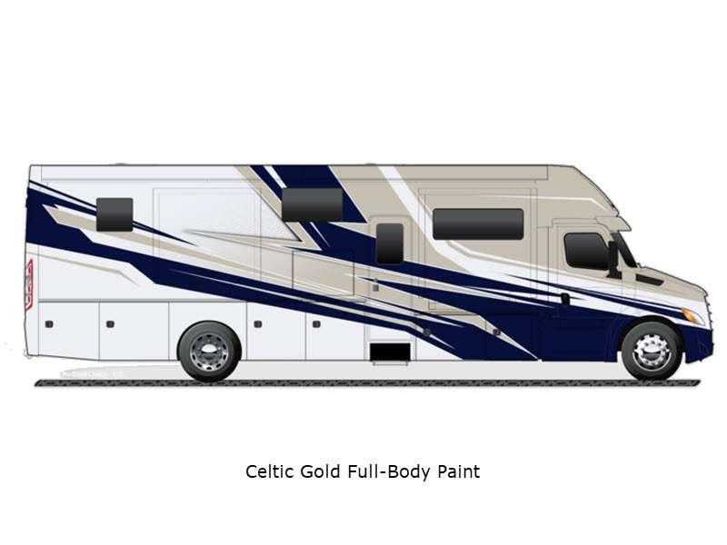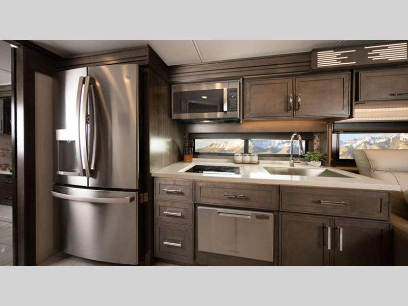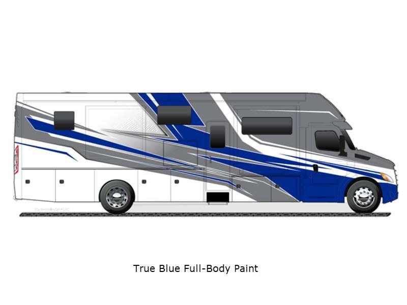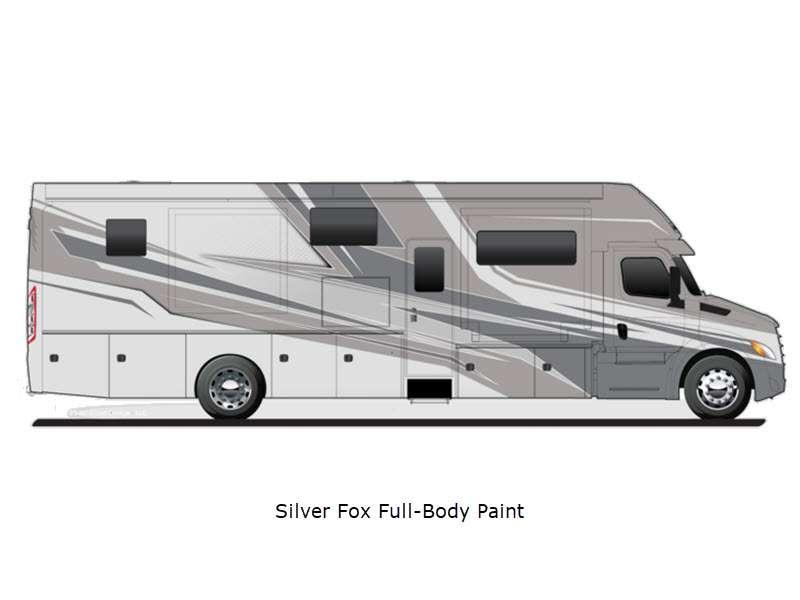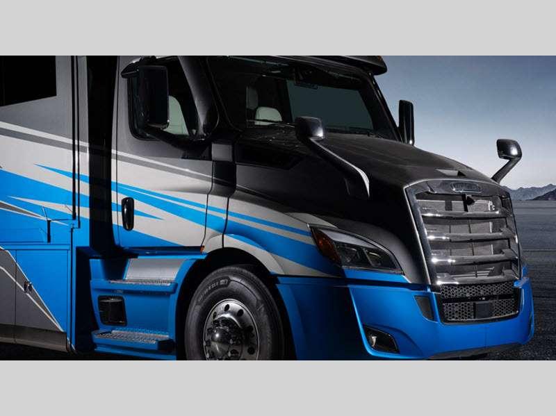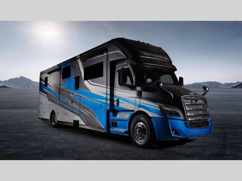 Sleeps 5 Slides 4 Length 42 ft Ext Width 8 ft 8 in Ext Height 12 ft 6 in Int Height 7 ft Interior Color Brownstone, Mineral, Oxford Exterior Color Velocity, True Blue, Celtic Gold, Midnight Envy, Silver Fox, Black Onyx- Full Body Paint Hitch Weight 20000 lbs GVWR 41000 lbs Tire Size 22.5" Generator 8,000W diesel with auto-gen start Fuel Type Diesel Engine Detroit DD13 GEN 5 Chassis Freightliner Cascadia 116 Day Cab Horsepower 525 hp Fuel Capacity 120 gals Wheelbase 312 in Torque 1850 ft-lb Refrigerator Type Stainless Steel Residential Cooktop Burners 3 Shower Size 40" x 30" Axle Weight Front 18000 lbs Axle Weight Rear 23000 lbs Water Heater Type Aqua Hot 250D hydronic water and heating AC BTU 30000 btu TV Info LR 50" Smart TV, BR Smart TV Awning Info Roof-mounted dual pitch integrated power patio with LED lights Gross Combined Weight 61000 lbs Shower Type Standard Electrical Service 50 amp Solar Wattage 400 watts Similar Floorplans