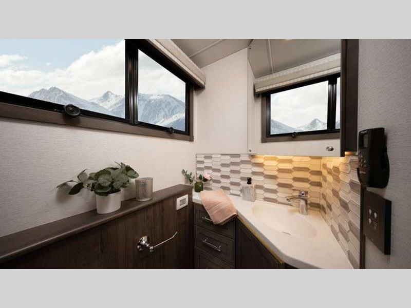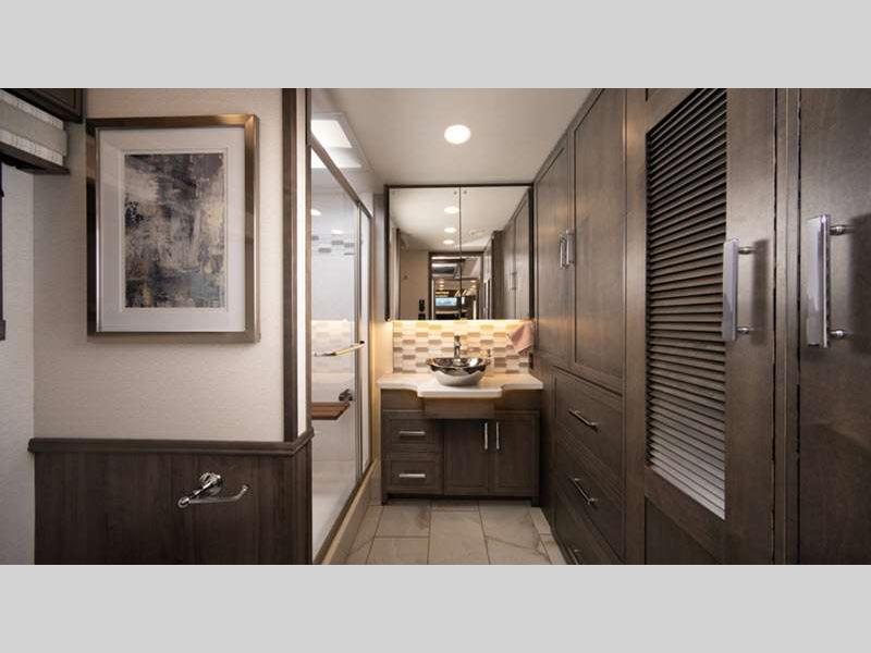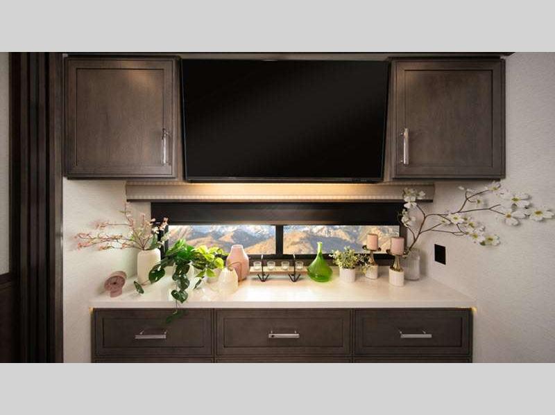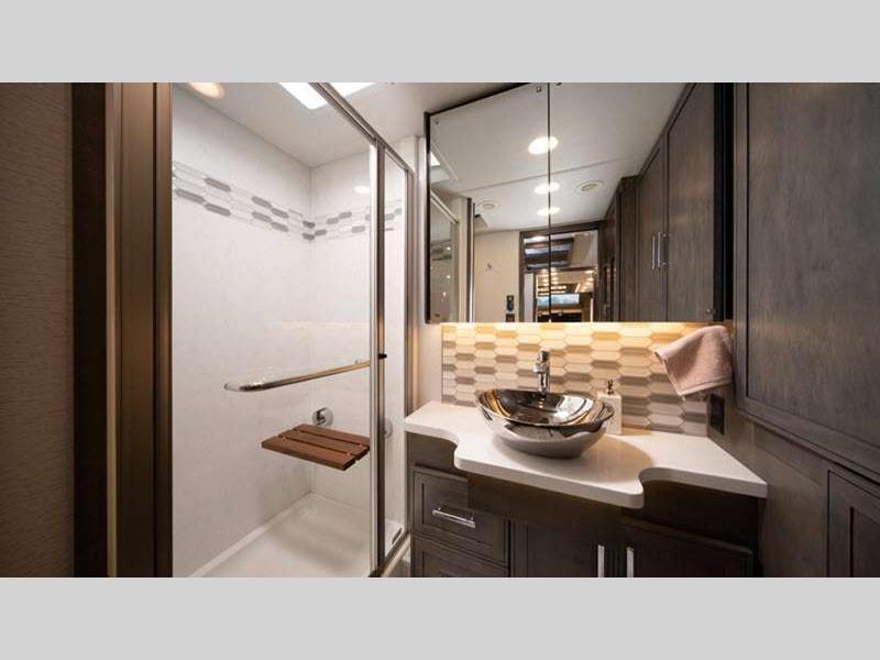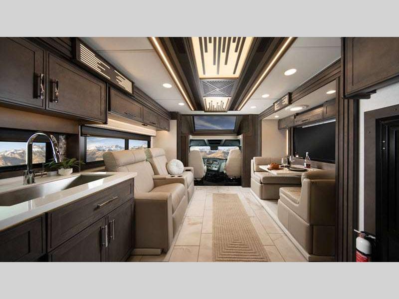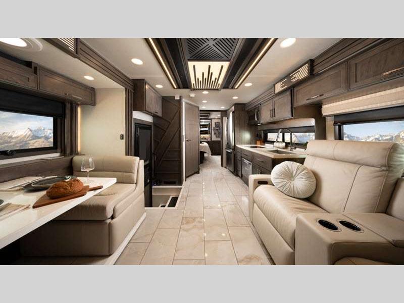 Seamless fiberglass construction, insulated Tuff-Shell™ walls, and full-body paint ensure durability and a quiet ride, while robust power systems, including generator, solar, inverter, and Aqua-Hot, support effortless off-grid capabilities. Inside, refined finishes, porcelain tile floors with in-floor heat, premium leather furnishings, smart technology, and a residential-style kitchen and bath create a comfortable, high-end living experience wherever the road leads.