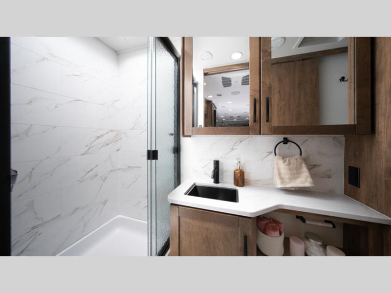 Sleeps 6 Slides 1 Length 34 ft 11 in Ext Width 8 ft 4 in Ext Height 12 ft 6 in Int Height 7 ft Interior Color Stillwater Exterior Color Partial Paint, Harvest Night, Night Shade, Summer Equinox, Winter Sky. Hitch Weight 12000 lbs GVWR 22000 lbs Fresh Water Capacity 53 gals Grey Water Capacity 31 gals Black Water Capacity 32 gals Tire Size 245/70R19.5 Furnace BTU 30000 btu Generator 6,000W generator with auto-gen start Fuel Type Diesel Engine 6.7L Power Stoke V8 Turbo Diesel Chassis Ford F600 4x4 Horsepower 330 hp Fuel Capacity 67 gals Wheelbase 248 in Number Of Bunks 2 Available Beds Queen Torque 950 ft-lb Refrigerator Type 12V Refrigerator Size 10 cu ft Cooktop Burners 3 Shower Size 32" Number of Awnings 1 Axle Weight Front 7500 lbs Axle Weight Rear 15500 lbs LP Tank Capacity 56 lbs. Water Heater Capacity 10 gal Water Heater Type Gas/Electric AC BTU 15000 btu TV Info LR LED HD Smart TV. Awning Info 18' Electric with LED Lights Gross Combined Weight 34000 lbs Shower Type Radius Similar Floorplans